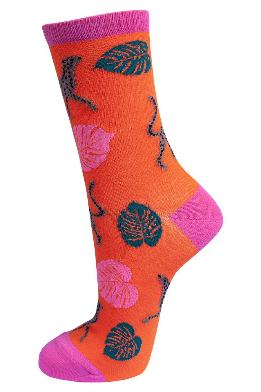 Bold and vibrant these Cheetah and leaf print ladies' bamboo socks are fun to wear. Made from naturally breathable bamboo fabric, these novelty ankle socks are designed to keep your feet fresh and comfortable. Perfect for everyday wear, these vibrant animal socks can be worn for any occasion. UK Size 3-7.