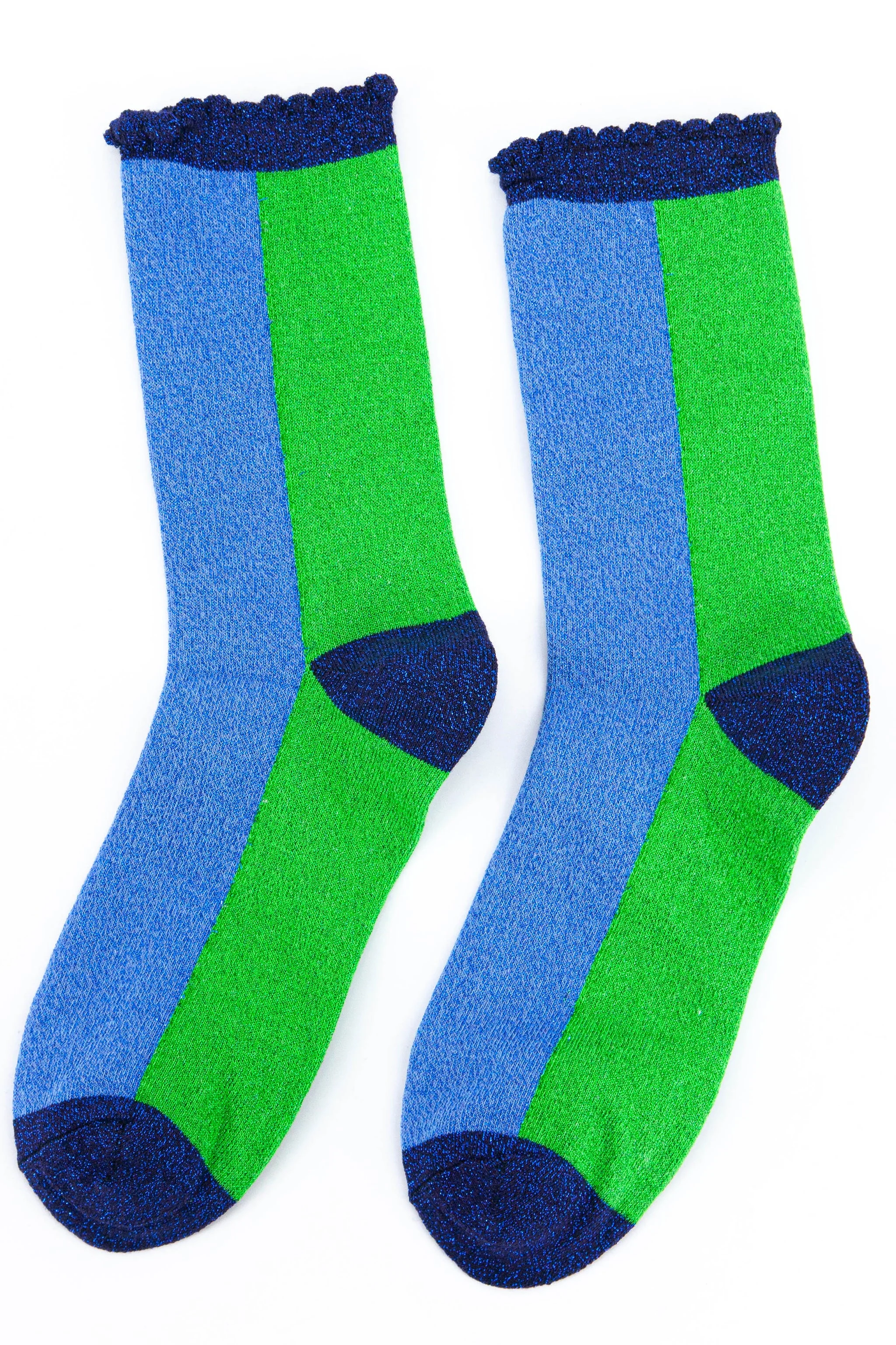 Designed in the UK, these glitter socks are crafted from soft blended cotton. Bold, contrasting colour block socks in blue and green with an eye-catching sparkle. Naturally breathable with a luxuriously comfortable scalloped cuff.