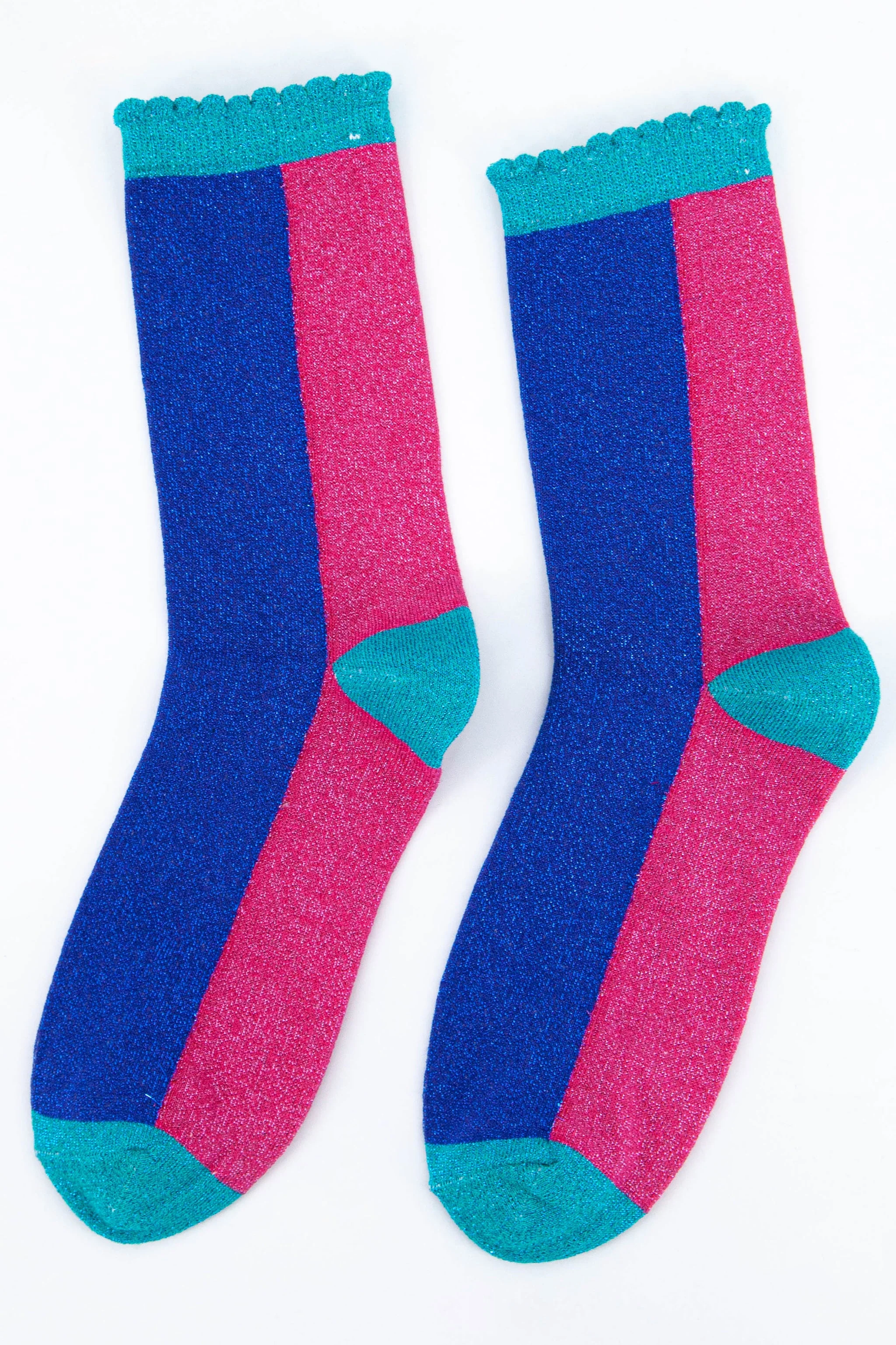 Designed in the UK, these glitter socks are crafted from soft blended cotton. Bold, contrasting colour block socks in blue and pink with an eye-catching sparkle. Naturally breathable with a luxuriously comfortable scalloped cuff.