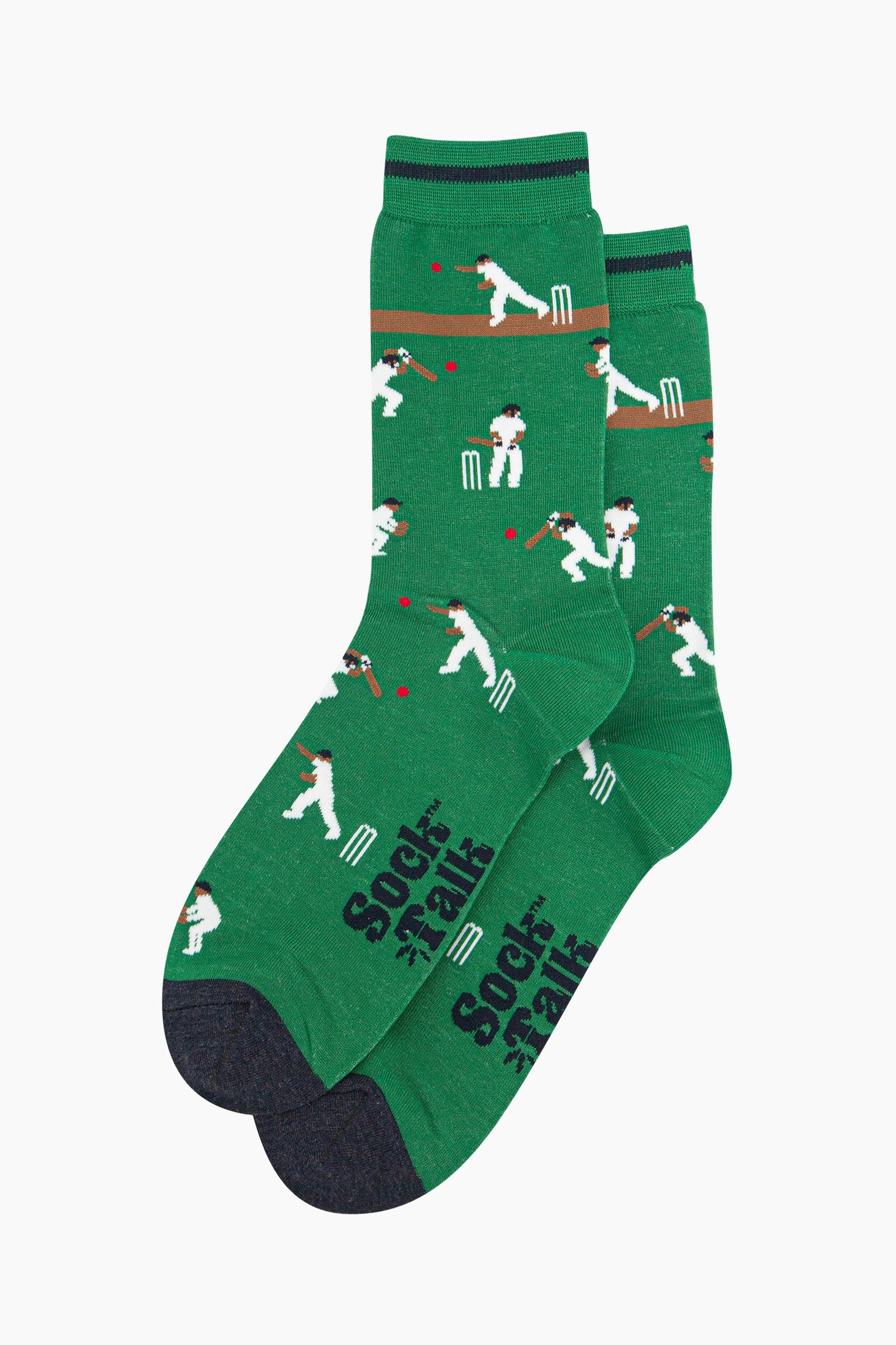 Crafted from naturally breathable bamboo these sports inspired dress socks feature cricket players in action. These beautiful socks are eco-conscious and feel luxuriously soft. Finished with a classic striped cuff for a comfortable fit.