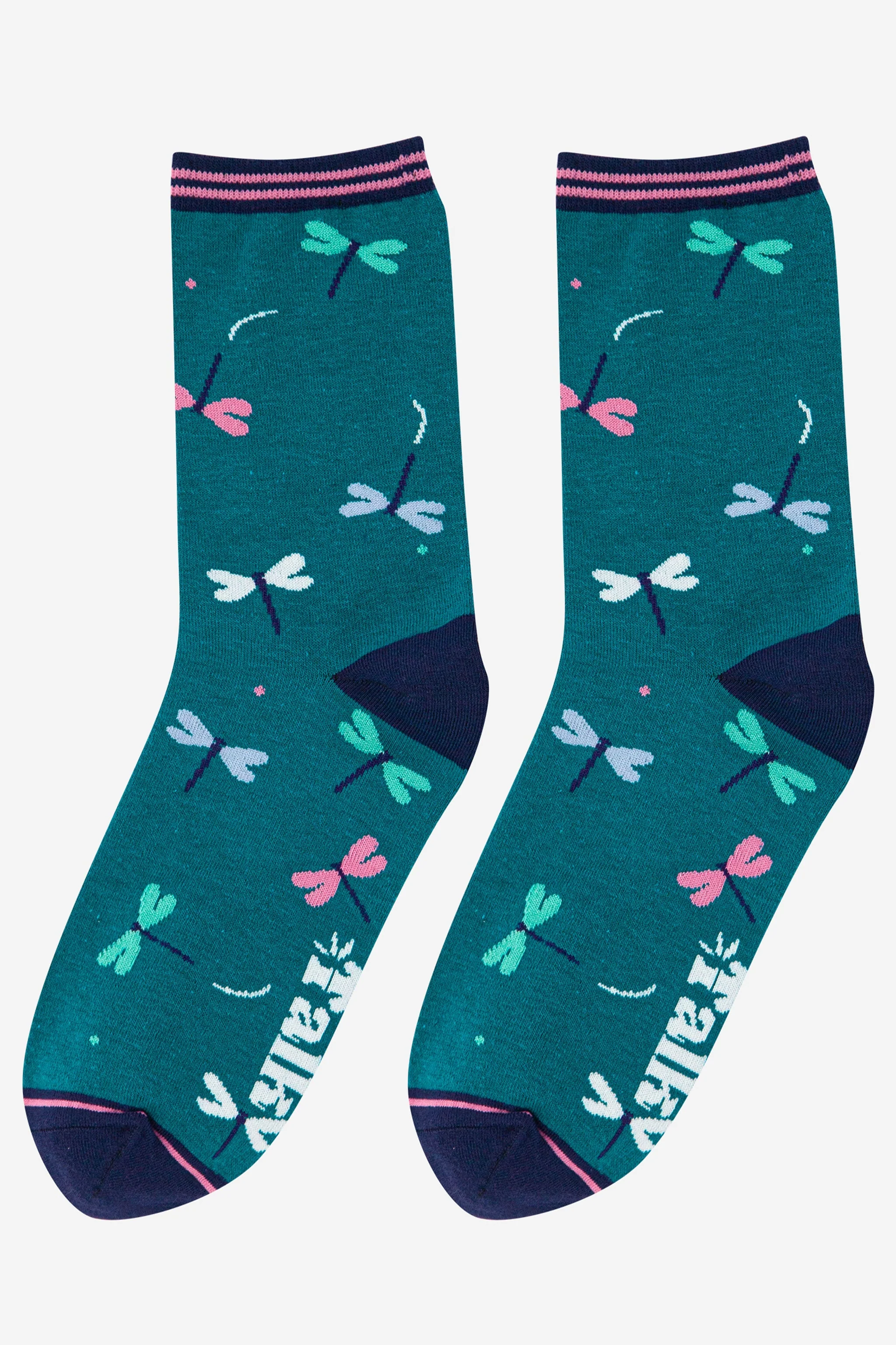 Women's repeating dragonfly print bamboo socks finished with a striped detail cuff.