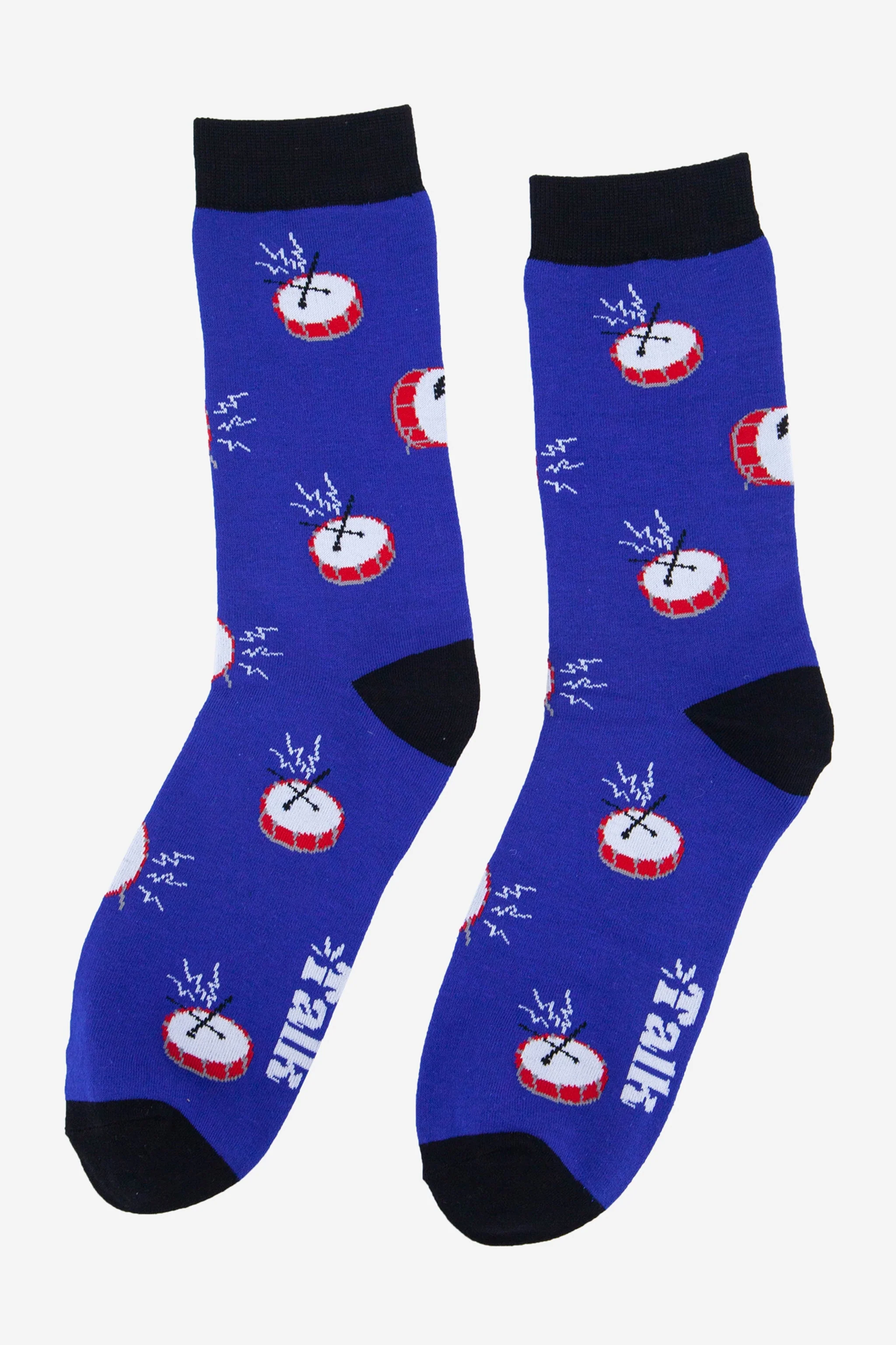 Men's rock band themed drummer bamboo socks with a banging drum design.