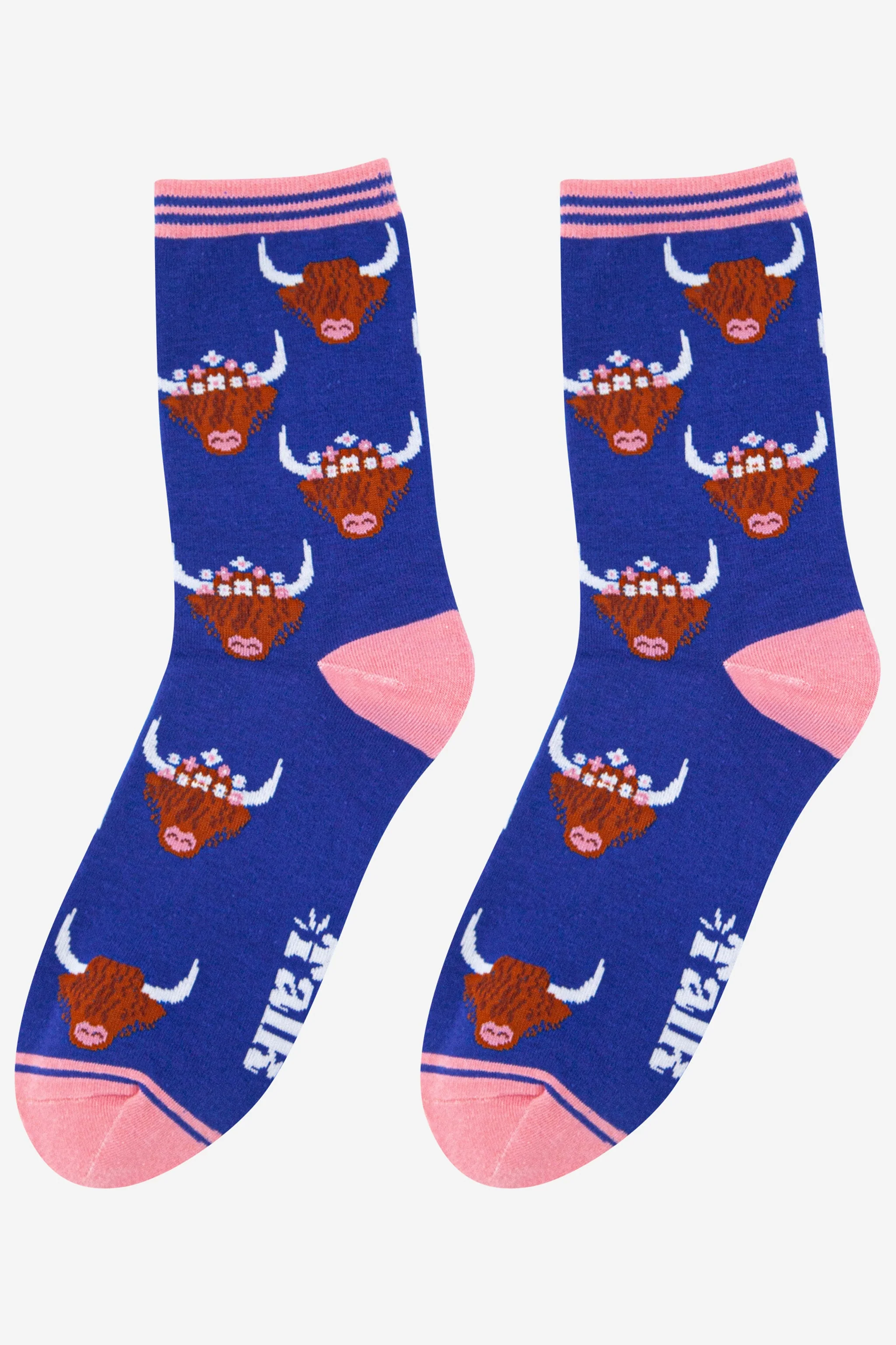 Highland Cow Floral Crown Bamboo Socks in Blue