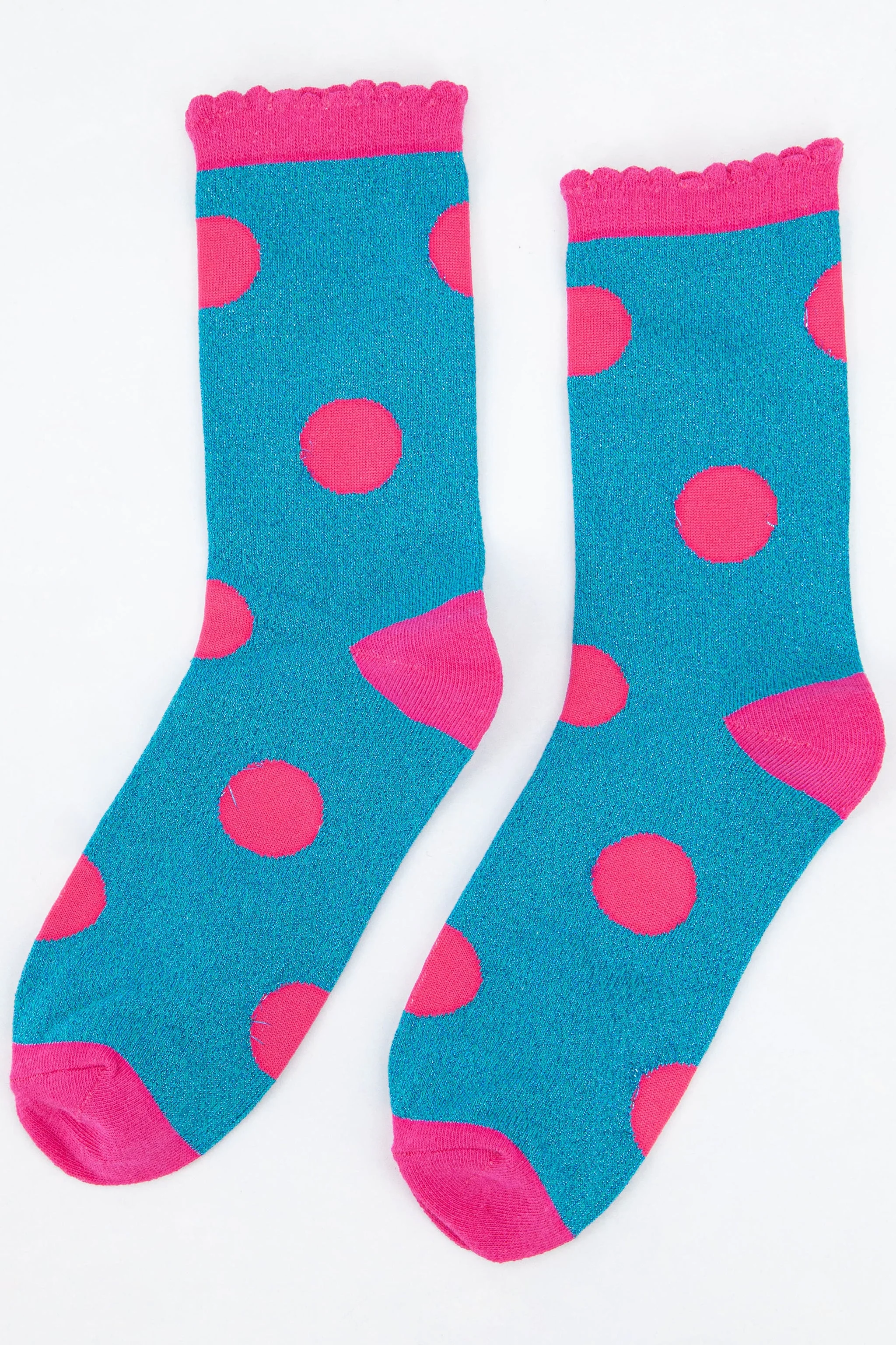 Large polka dot spot print ankle socks with a scalloped cuff and a sparkling glitter thread woven throughout.