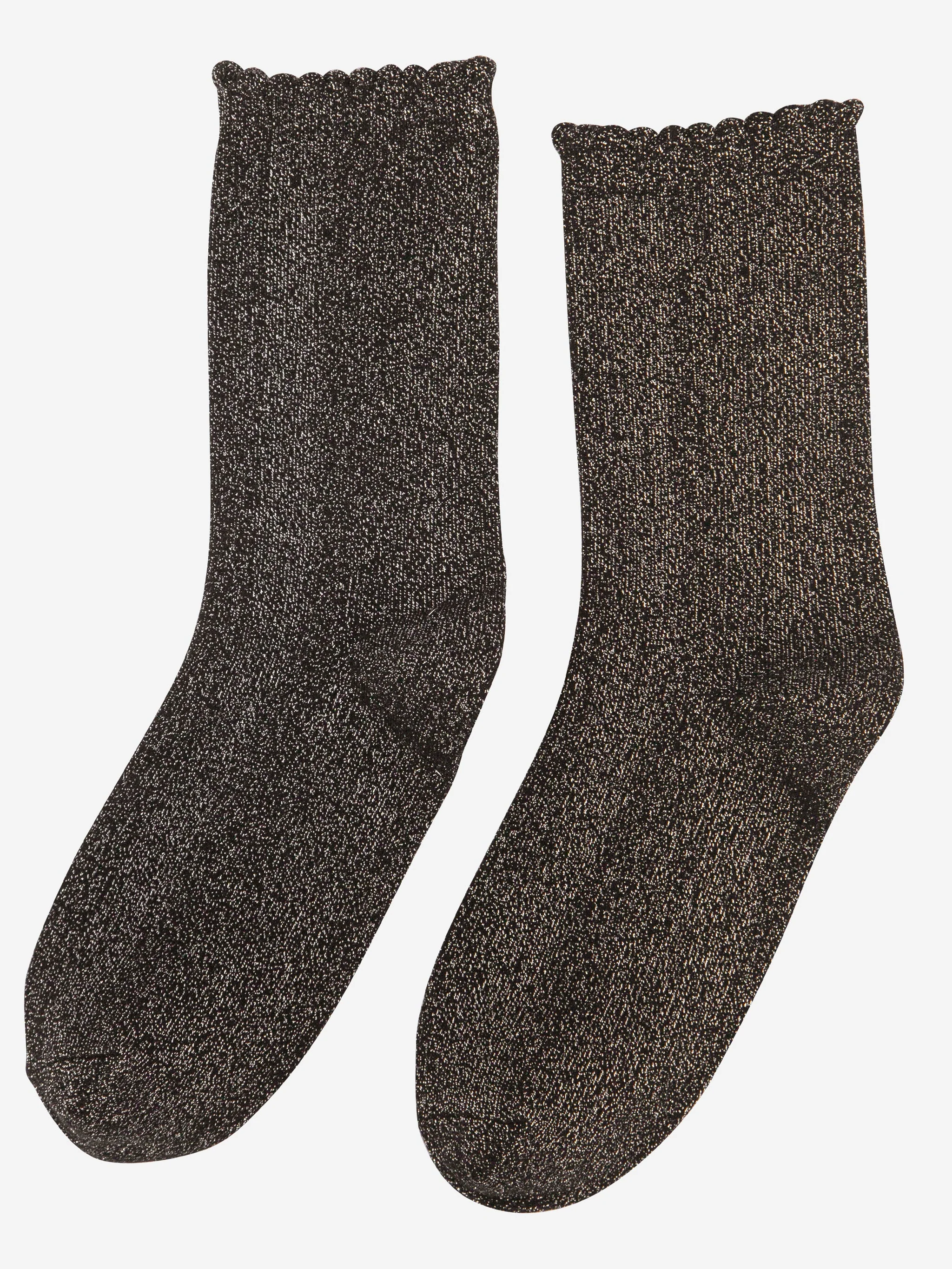 Plain combed cotton glitter socks finished with a luxuriously comfortable scalloped cuff. Wear or gift for any occasion.